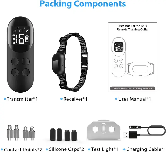 The T200 Dog Training Collar is a state-of-the-art remote training system designed to help you communicate clearly and effectively with your dog. It offers three adjustable training modes:sound, vibration, and static stimulation, allowing you to choose the most suitable method for your dog’s temperament. The collar receives signals from a wireless remote control that works up to1,000 feet (approx. 300 meters), giving you freedom to train your dog at a distance whether in the park, garden, or countryside. The collar and remote are both rechargeable via a magnetic fast charger, fully powering up in just two hours for up to 15 days of use.